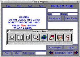 Business ToolsContains electronic tools for recording employee hours-worked and for keeping track of billable project hours. Both the Employee Time Card and Project Tracking Systems are designed to be used with any number of employees and projects. These helpful tools automatically calculate earnings and charges and feature find buttons for quickly locating names, etc. Other digital tools include:
